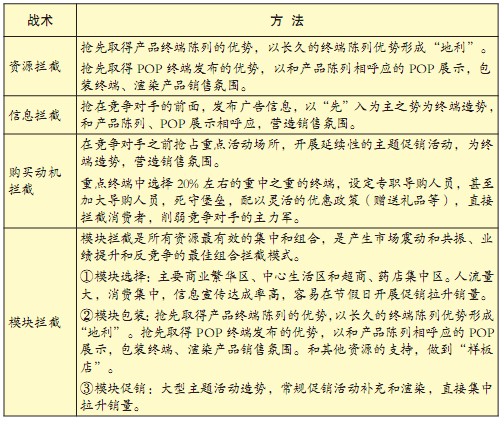 “海、陆、空”终端拦截战术的运用重在“先”,没有“先”,终端拦截将处于被动,处处受制约,处处挨打,市场人员只能疲于应付。终端拦截战术的具体运用如表5-9所示。