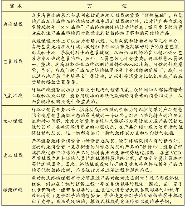 当我们的产品遭到了竞争对手的强势“终端拦截”时,我们的销售经理人该如何变“终端拦截”为”中断拦截”,既而成就我方产品对竞争对手的“终极拦截”,夺回失去的“滩头阵地”呢?下面向大家介绍一下反败为胜的几点策略与方法,具体如表5-10所示。