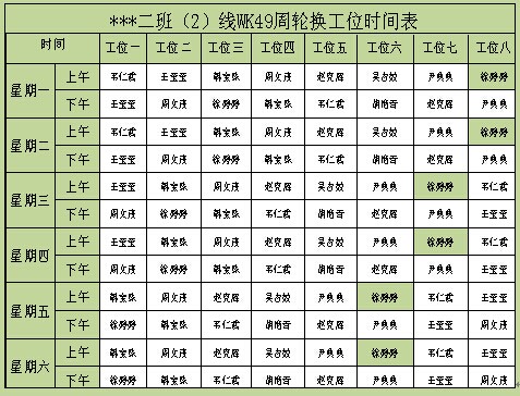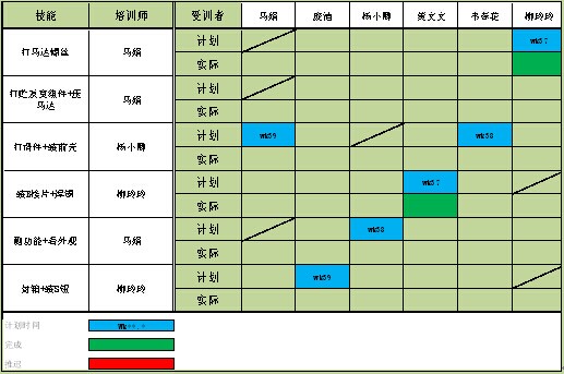 从员工技能表中我们可以看到,这条生产线的要求是3*3*1,即每个员工最少会操作3个工位,每个工位最少有3名员工可以操作,最少有1个人可以操作全部工位,确保整个生产线可以正常运行。但是其中标示红色部分,分别表示某个工位,或者某个人的技能并没有达到要求,这给我们下一步的培训计划提供了基础的信息支持。