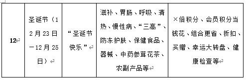 2.全品类联动活动(包括时节促销、每月主题营销、四季“赢”销、季节养生、阶段特卖、特病人群等),如春节联动、清凉一夏、春生养肝等。
