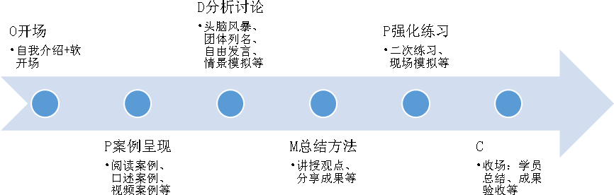 第五步,Practice-强化练习。学以致用是根本,通过案例需要举一反三,联系真实的应用场景,进行反复练习,才能更加广泛地解决问题。通常案例中的情境不能面面俱到,多是典型的、重要的、带来重大影响的,而现实工作中会更加复杂多样。因此,我们在强化练习环节,根据课前调研或现场学员的真实需求、设定场景、安排练习、组织分享。如果强化练习在课堂上条件受限的情况下,可以安排课后练习和分享,达到学以致用的目的。