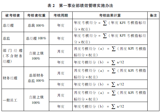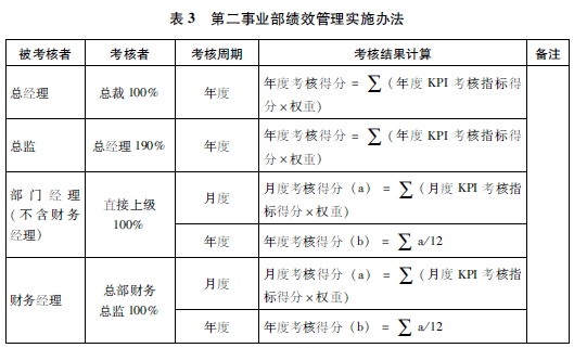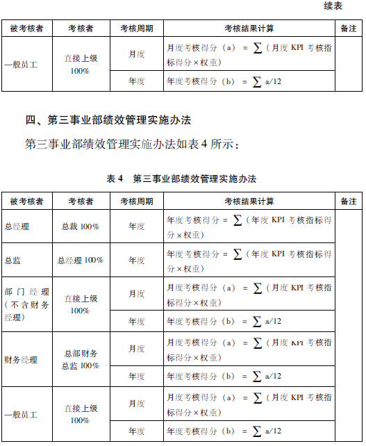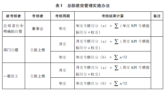 3)绩效考核得分计算。当期绩效考核得分由各项KPI分值加权得出(有“否决性”指标的,必须符合要求),计算公式为:
