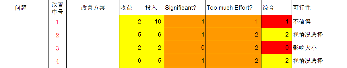 第二列投入项为改善其问题所需投入的资源总和(主要为人力、物力),从1~10,值越高代表投入越大。