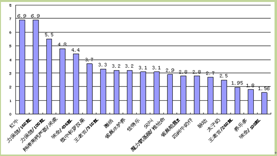 从功能饮料及其相关替代饮料的零售价格(图3-6)可以看到,4~6元是功能饮料的价格区间,已经得到市场的接受。超过6元,尤其是到8元及以上的功能饮料必然造成消费者接受障碍。零售价6.9元的增强型红牛,也会面临销量陪衬的境地。
