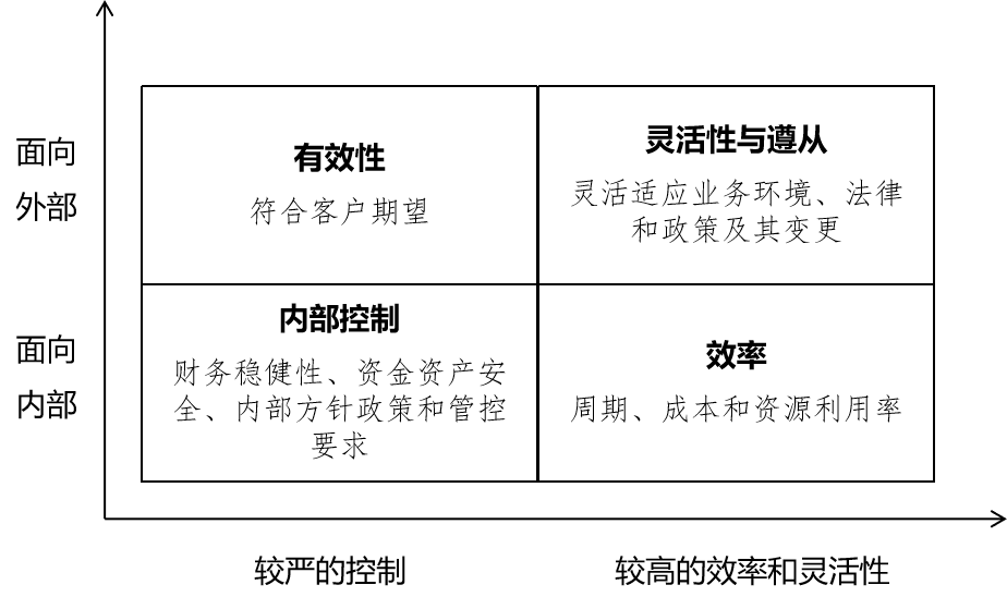 这类流程最重要的是满足内控的要求:资金资产安全、报表真实准确、遵从内部要求、财务稳健。比如应收流程、资产管理、采购管理等。有些公司会从内控的角度识别出高风险流程,比如涉及采购、销售、资产、资金管理等高风险流程,这类流程重点关注内部控制要求,使风险处于可控状态。