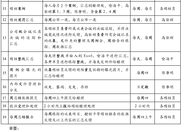 责任:以上两项工作列入各稽核员考核数据里面,未按期完成的按规定主动承担责任。经理和老师可以根据工作状况临时调整工作安排。