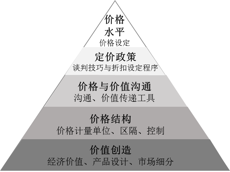 在《定价战略与战术》一书中,作者给出了一个战略价格制定的“金字塔模型”。“战略定价金字塔”分为五层:底层是创造顾客真正可认知的价值;在价值基础上,确定相应的定价框架结构;一旦结构完成,市场营销就制定出相应的信息与工具,向目标顾客充分传递和沟通产品的信息和价值;在做出最后定价之前,还需要有一整套的定价政策,确保不论遇到如何强势的顾客或强悍的对手,产品价格都不会轻易变动,使定价结构得以保持完整。