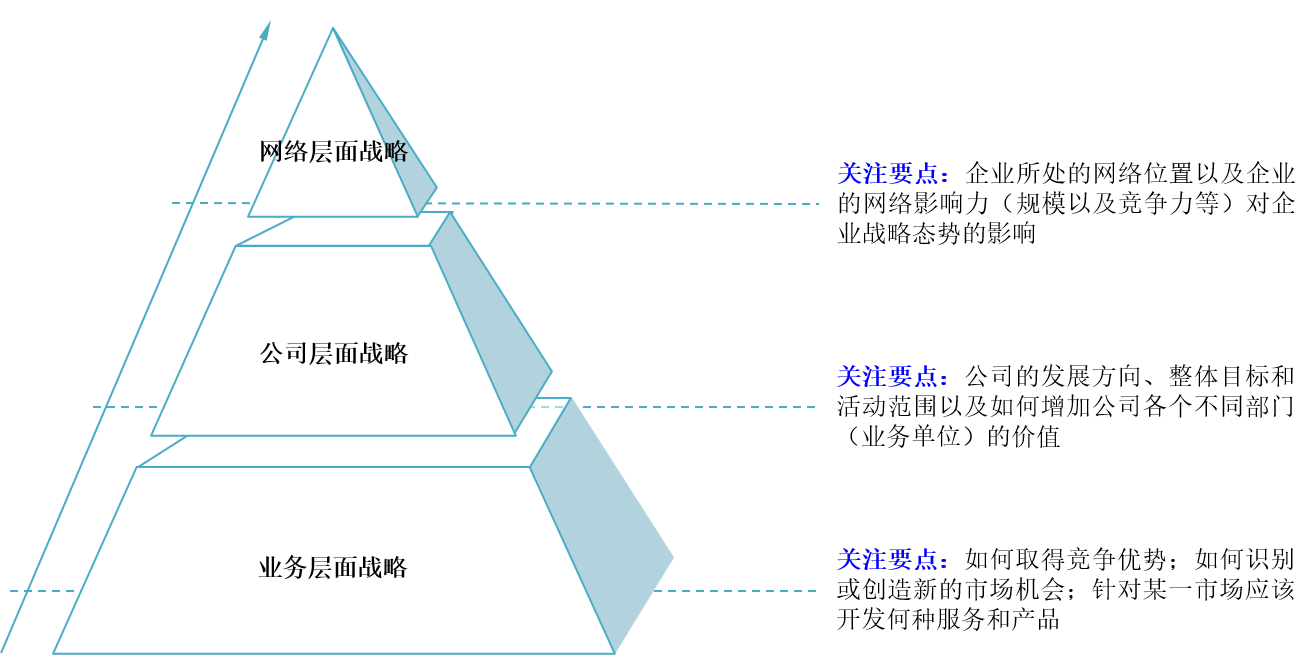 与业务层面、公司层面战略相比,网络层面战略(简称网络战略)最为抽象(业务战略最为具体),它是战略层次扩张的结果,不管是虚拟组织,还是联盟和合资,当范围扩大到一定程度,各种组织间就不可避免的形成一个社会网络结构(以战略集群和战略联盟网络两种模式为主)。在组织间的网络中,企业所处的网络位置及企业的网络影响力(规模、品牌、技术领先性)会影响企业的战略态势。当今企业必须突破以自我为中心的焦点思维(甚至要突破以客户为中心的思维。“以客户为中心”在某种意义上也是一种狭隘的思维),重新站在网络的角度来重新审视企业的商业实践和合作伙伴。
