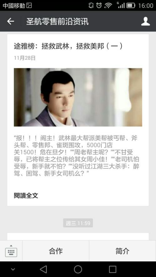 图3-1到3-4为笔者节选的业内四个零售公众号所发布的内容,分别为大悦城、寺库网、银泰武林总店及圣航零售前沿资讯的公众号,这四个公众号也是零售从业人员普遍要关注的四个公众号。从各公众号发布的内容来看,各有千秋,虽然笔者也长期从这几个号上参考、转载、采编一些内容,但从内容的可读性来说,寺库网和圣航零售前沿资讯已经具备“媒体”的属性,而大悦城和银泰武林总店日常仍以促销活动为主。
