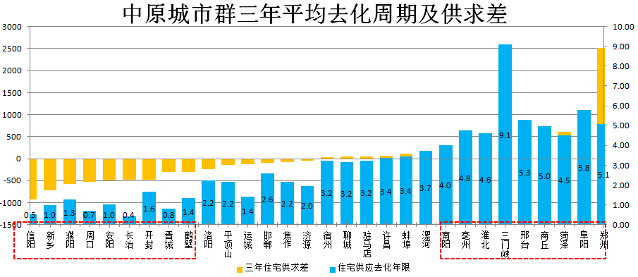 中原城市群住宅供应去化年限为2.98年,去化周期小于3年的有15个。整体来看,开封、洛阳、南阳、安阳、新乡、平顶山、焦作、周口、信阳、鹤壁、濮阳、济源、长治、晋城、运城、邯郸等城市市场供不应求;郑州、许昌菏泽等城市市场供过于求。