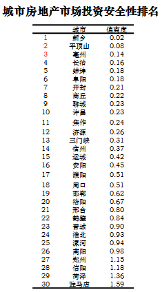 中原城市群城市房地产投资安全性综合排名TOP3的城市为:新乡、平顶山、毫州。偏离度大于1的城市投资风险较高,应谨慎投资,主要城市有郑州、信阳、菏泽、驻马店。