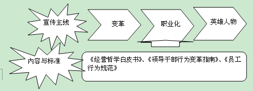 举例来说,公司在不断地进行管理提升和变革,公司宣传的主线和中心内容是变革,变革的具体方向和内容是职业化行为,基于职业化行为的典型人物,不仅包括正面人物,还包括反面人物。宣传主线是基于公司现有的制度来实现,比如,《经营哲学白皮书》《领导干部行为变革指南》《员工行为规范》等体现专业化的具体内容。如图4-11所示。