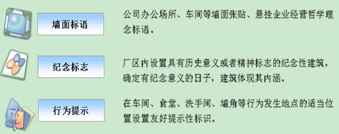 第一,墙面标语,利用公司办公场所、车间等墙面张贴、悬挂宣传公司经营哲学理念的标语。
