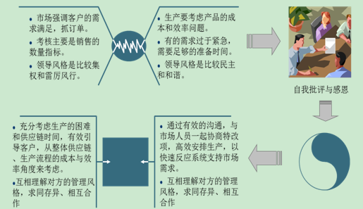 在这种思维方式之下,一方面不利于相互协作,不利于建设性地推动工作,另一方面,由于总觉得自己没有问题,所以也不利于自身素质提升。而恳谈会就是要将这种“反抗式沟通”转变为“支持性沟通”。它的作用机制是通过对部门间工作内容(业务差别、角色差异、领导风格差别、考核导向差异等)的讨论,最终达到相互理解和支持,形成最优化的解决方案。