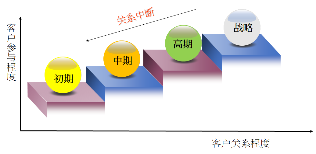 高期合作阶段:成为客户的主要供应商,双方部门之间的沟通更加通畅,合作更加紧密,客户关系的层次也从销售与采购向高层对高层发展。通过双方高层频繁互动或参与谈判,从更高的层次解决利益分配,公平合理地解决双方利益冲突,尽可能保证双方的合法利益,也不损害双方的关系,或者把饼做大,实现双赢。