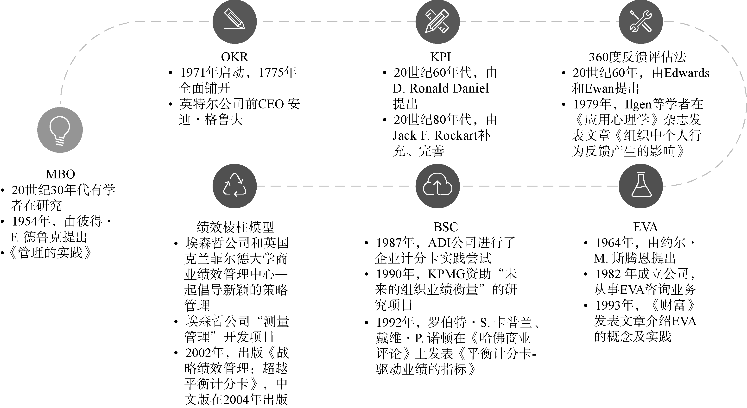 绩效管理理论和实践经历了漫长的发展历程,产生了很多绩效管理工具,包括 MBO、OKR、KPI 等,摘录主要的如图附 A-3 所示。