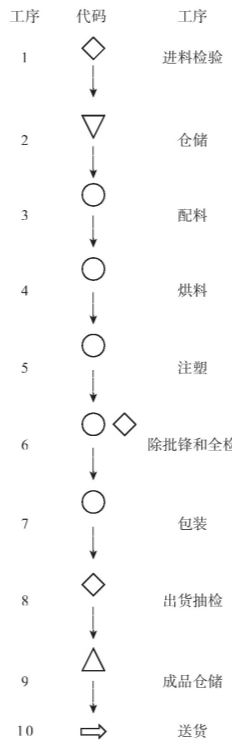 代表成品仓储, 代表检验, 代表数量确认, 代表送货或搬运。工艺流程图要与控制计划、PFMEA严格保持一致,比如工艺流程图有10个步骤,那么控制计划和PFMEA也是10个步骤。工艺流程图案比如图2-1所示。