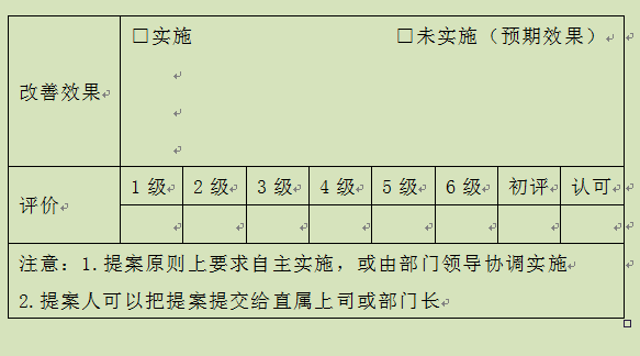 就是说,效果好的提案要想获得较高级别的奖励,就必须使用一般型提案格式,但并不是说使用一般型提案格式的提案都可以被评为较高奖励级别。在这种制度安排下,有条件的员工会尽量采用B表提出改善提案。