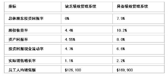 绩效管理能给企业带来直接的好处,所以,很多企业都持续地实施绩效管理。我们多年的企业管理咨询经验显示,实施了绩效管理的企业,其绩效都有明显的持续改善。据美国某公司对一些上市公司的调查资料显示,实施了绩效管理的企业和没做绩效管理的企业其各项指标结果差距非常大,具体如表1-1所示: