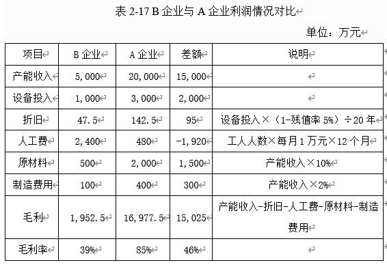 表2-17展示了B企业和A企业的利润情况对比。从表中可以看出,通过技术升级和引入先进生产线,A企业实现了更高的产能和更低的成本,从而显著提高了净利润。
