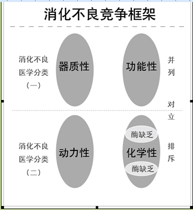 第一种分类中的器质性和功能性是个并列关系;第二个分类中的动力性和消化性的也是个并列关系。把这四类放到一起,总体上是并列、对立、排斥的关系。即便是把酶缺乏放到化学性的当中,也等于树立了三国强敌,每个强敌的国家都有若干猛将。