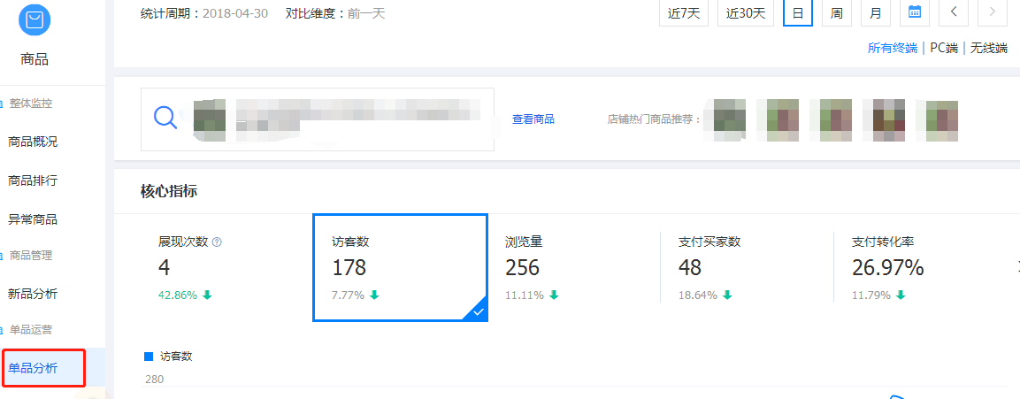 还包括单品分析及单品诊断等,单品选择是选择展现次数多、访客多、浏览多、支付买家数多及支付转化率高的。如图10-16所示。
