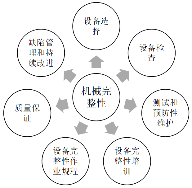 执行机械完整性管理是在合理的时间内,确保落实设备的检维修及保养,预知设备的运转状况,及时对设备进行改善和维护,确保设备安全可靠运行,减少引起安全和环境事故的设备故障,降低企业的生产运营成本。机械完整性管理至少应包括设备选择、检查、测试和预防性维护、设备完整性培训、设备完整性作业规程、质量保证、缺陷管理和持续改进等要素,其他内容可以针对企业的规模或具体要求进行补充和完善。
