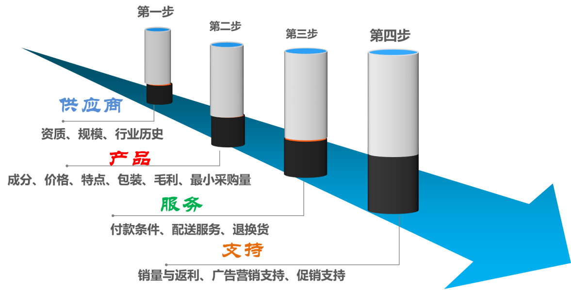 采购部门是一个对外窗口,一切信息汇聚源头均在采购部门,采购部是连锁公司中最有价值的部门。所以,采购人员也是公司重点监管对象,因此,采购人员首先需要安全性需求,一是按照公司惯例和现行数据进行分析判断;二是及时向主管采购经理汇报情况。一般情况,一家连锁药店的采购信息判断的基础是消费者数据与品类数据分析,这里包括例行的品类数据分析,也包括常见病种的品类分析,以及品类组合策略分析,缺货品项的引进,零毛利、负毛利品项调整,以及周、月、季的同比、环比趋势图分析。所以,把握连锁需求和降低采购谈判难度,一定要关注连锁产品情况,主要是竞品情况,从而寻找产品开发的机会。图中所列连锁四部法,就明确列出作为连锁药房合格供应商需要被考评的相关要素。