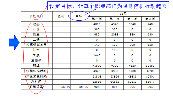 通过合理分解效率损失,记录3~5周的实际绩效,一般就可以了解损失的具体分布,原因,并设定目标给各相关部门。接下来设定一系列的改善课题逐一解决。其中相对简单的课题可以采用PCDA的QC项目形式,复杂一些的可以采用六西格玛方法推进。