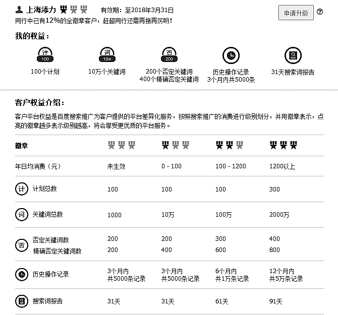 第一项:【客户权益】。说白了,就是你掏多少钱的广告费能够享受什么样的好处。广告预算越高,权益越多。点击进入,出现如图3-12的界面。