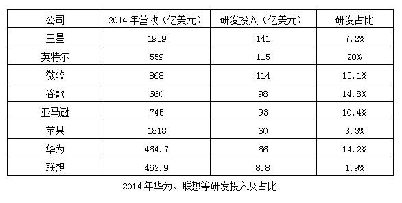 2006-2015年联想公司财年的财报显示,过去10个财年,联想仅2015财年的研发支出占了整体收入的2.6%,其余年份均低于1.9%。连续十年,联想累计投入的研发成本一共44.05 亿美元,尚不及华为2014年一年的研发支出。