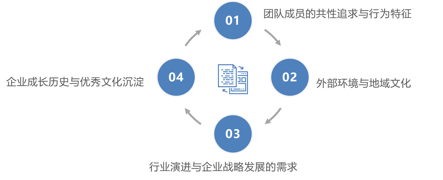 在优秀标杆企业的组织文化分享和提取过程中,需要关注对企业文化进行特色定位。企业文化特色定位需考虑如下因素:团队成员的共性追求与行为特征、外部环境与地域文化、行业演进与企业战略发展的需求、企业成长历史与优秀文化沉淀。团队成员的共性追求与行为特征的考虑可以帮助组织文化更好地在核心高管团队中达成共识,外部环境与地域文化的考虑可以帮助组织文化在企业形象、雇主品牌影响建立上发挥更大作用,行业演进与企业战略发展的需求的考虑可以帮助组织文化在推动组织发展、业绩目标达成,企业成长历史与优秀文化沉淀的考虑可以帮助组织文化提升涵义,可以更快速地扩大影响力。如图4-4所示。