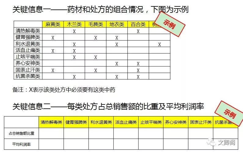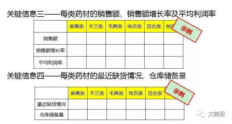 案例分析和思考:这道题目的信息量比较大,信息表就有四张。每个药材和处方之间有联系,然后药材的数据有销售额、销售额增长率、平均利润率、缺货情况和仓库储备量。就单一药材而言,有7~8条信息,达到了信息量大、维度多的要求。进一步分析,资料分为主要信息和次要信息。主要信息是1,2,4表 {在哪?},其他是次要信息。