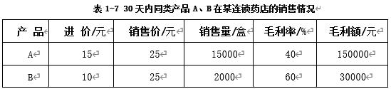 那么连锁药店到底是要毛利率还是要毛利?我们来看30天内同类产品A、B在某连锁药店的销售情况(见表1-7)。