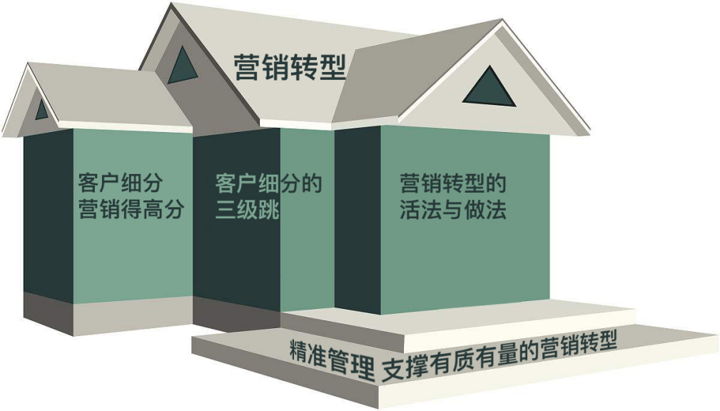 客户细分,看似营销层面的一个策略而已,实则为战略经营的一个系统工程。一个企业的精准管理,比如,财务生产与交付系统,构成了营销转型的基础;三根顶梁柱,构建了营销转型的框架;而亮丽炫目的屋顶,则为营销转型的成果。