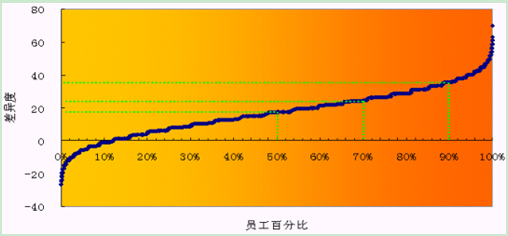 根据对理念和行为的评价差异度的比较分析,有超过88%的被调查者理念与行为差异度大于零,有50%的人差异度大于17,30%的人差异度大于24,10%的人差异度大于36,表明理念先于行为的差异程度比较大。 如图1-1所示。