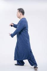 4.右脚涌泉一踩,将所有重量与重心慢慢移交给左脚。在移交重心的同时,双手反方向移动,左手臂掤出,向身体前方荡起至胸前三个拳头长的距离,右手由原来的胸前慢慢自然放下,手掌朝后,大拇指在裤腿缝处,中指微微翘起。脚停手停、手停脚停;一动无有不动、一静无有不静;此时上半身向着45度的东北方向,两手背自然保持美人手。