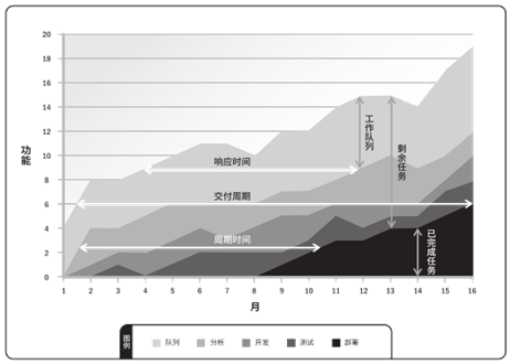 在图8-19的累积流量图示例中,项目流程有五种活动状态:队列、分析、开发、测试和部署,颜色依次加深。用累积流量图观察一个团队的工作进展时,数值本身不能说明问题,但数值的变化趋势(看是否有拓宽的趋势或增厚)会给我们一些预警。告诉我们:哪个环节可能碰到了问题或成为瓶颈。这个时候需要到团队中去充分了解情况,识别真正的问题或潜在的风险并采取相应的应对措施。