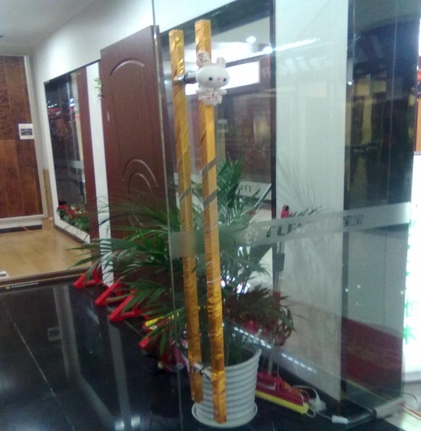 图4-30用金布包住扶手杆,而且上面还有个兔子挂件。图4-31是救急策略,直接把礼品粘上去。