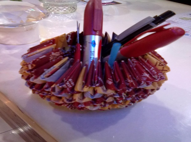 (2)礼品集中摆放,借助小桌子往上摆,摆出个漂亮的金字塔队形。