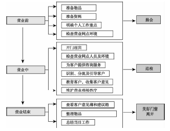 (1)召开晨会。通过晨会明确当日工作重点、规范基础服务礼仪、检查员工标准着装。晨会是网点在每日开始对外营业前在营业大厅召开的例会,主要目的是振奋员工精神、鼓舞员工士气、点评员工工作、明确工作重点、开展员工培训,促使员工展示网点服务文化。