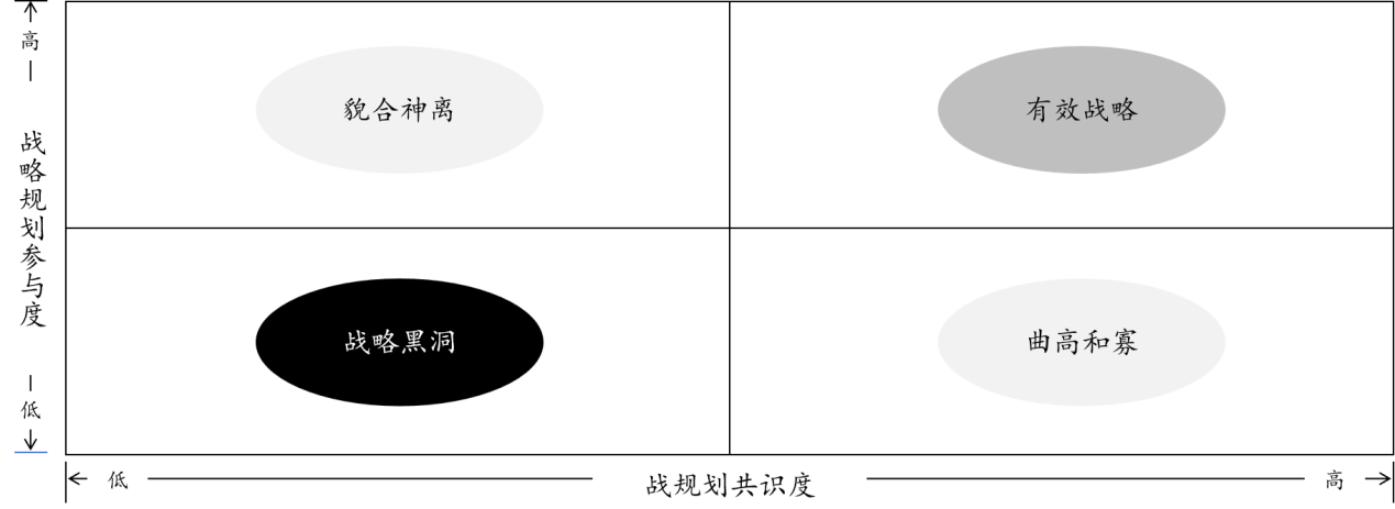 战略规划的参与度有利于提高战略规划的正确性,战略宣导有利于进一步提高战略规划的共识度。只有正确性和共识度高的“双高战略“,才是有效的战略并有利于执行。除此以外,要么就是“貌合神离”(看似参与度高,但其缺乏真正共识),要么就是“曲高和寡(战略意图没法真正在中基层贯彻)”,如图3-19所示: