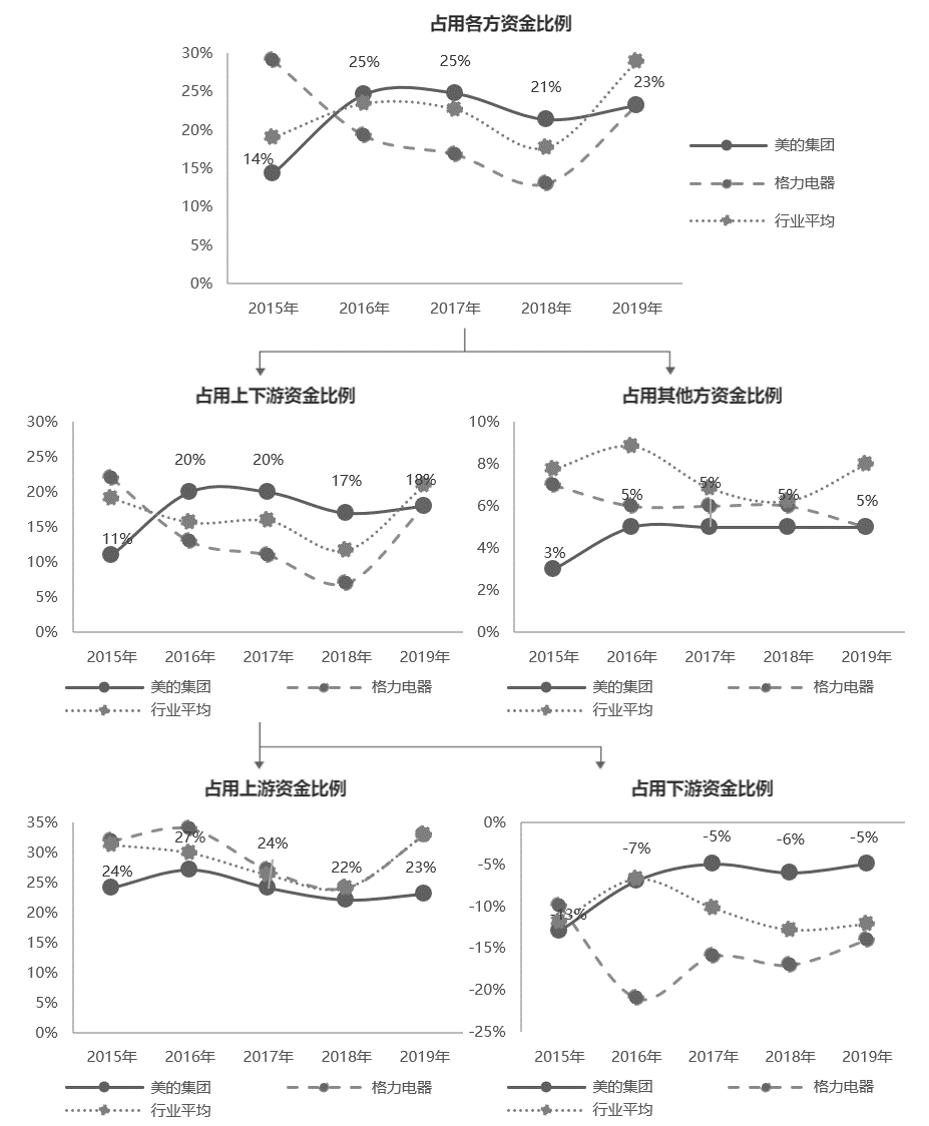 以美的集团为例,图8-38展示了美的集团、格力电器、行业均值在2015—2019年的占用各方资金比例的变化情况。