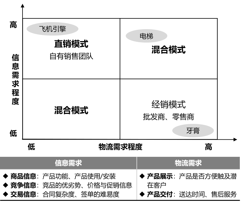 对于直销模式和经销模式的选择可以通过评估信息需求程度和物流需求程度对渠道通路进行初步选择。当客户对物流需求程度低但对信息需求高时,可以选择直销模式,通过直接与客户接触传递价值主张,促进成单且利润率高。相反,当客户对物流需求程度高但对信息需求低时,建议选择经销模式,快速低成本触及客户;若是其他情况,可选择混合模式,平衡不同模式下的利润率及运营成本。如图6-8所示。
