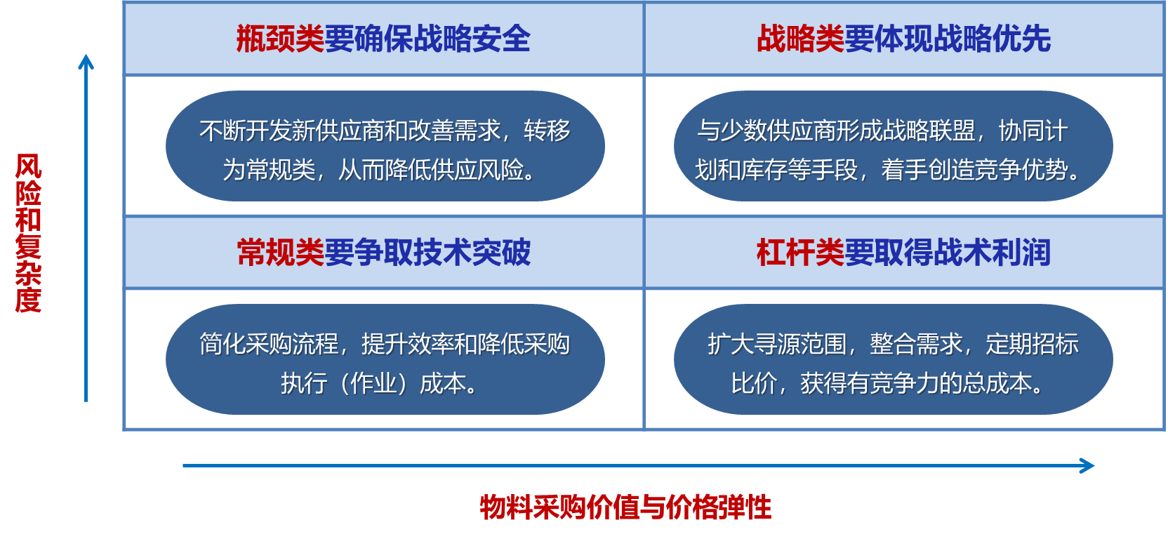 ‍‍对于右下象限的原物料,其供应风险和材料本身复杂程度较低,但采购数量、采购金额或价格波动风险都相对较高,我们将其定义为企业的杠杆类原物料,在制定采购策略的时候要体现成本领先原则,从这类物料中要能够获取更多的利润空间。具体措施有扩大供应商寻源范围,整合企业需求,定期招标比价,‍‍获得有竞争力的总成本。‍‍