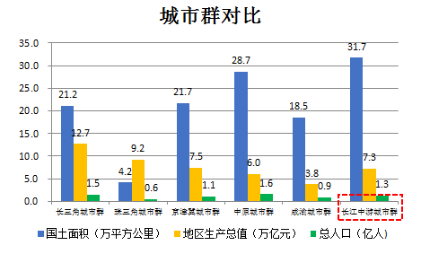 长江中游城市群国土面积31.7万平方公里,占全国的3%;地区生产总值7.3万亿元,占全国的9.75%;总人口1.3亿人,占全国的9.3%;