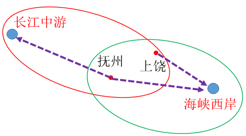 上饶和抚州2个城市同时纳入长江中游城市群与海峡西岸城市群势力范围,将2个城市分别与2个城市群的经济联系强度进行对比分析,上饶更倾向于融入海峡西岸城市群,抚州受2个城市群影响均较弱。