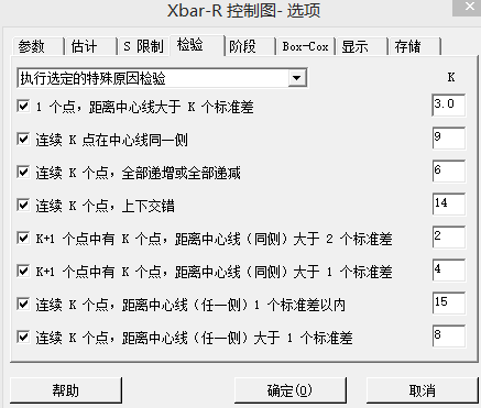 (4)在“Xbar-R选项-检验”中可以看到前面所说的控制图Xbar-R中8项判异准则,可根据需要选择,如图1-27所示。