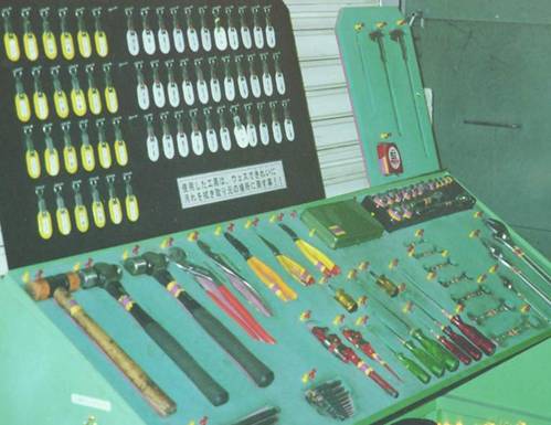 如图2-9所示,在摆放的每个工具下面都画上这个工具的形状,工具被取走了就能一目了然,同时使用者取走工具时挂上写有自己姓名的牌子,使工具的去处也一目了然。万一工具丢失也能得到及时的补充。