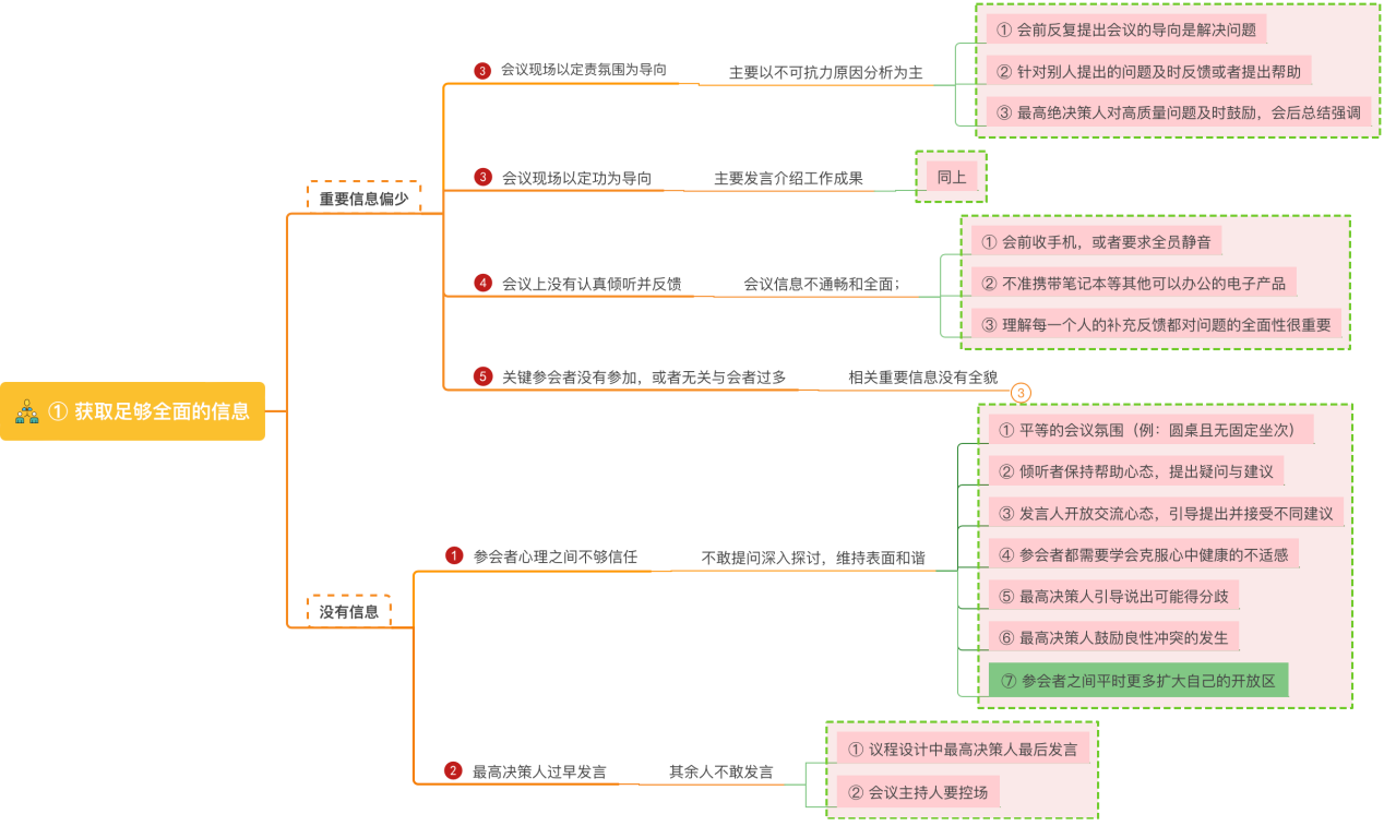 我们都知道的盲人摸象,有的人在自己的岗位看到的是大象的耳朵,我们就认为现实情况是一把扇子一样的东西;有的人看到的是大象的尾巴,我们描述的时候就会更加偏向绳子一样的东西;有的人看到的是大象的象牙,我们认为现实就是两根棍子。但一件事情的发生往往是众多相关因素综合形成,不同角度描述问题,不同岗位描述问题,呈现在大家面前的问题就会不一样。为了避免“盲人摸象”信息不足我们就过快决策的情况,会议的认真倾听与参与就变得尤为重要了。